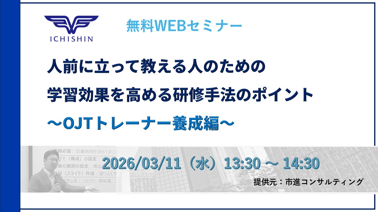 このセミナーでは、社内のOJTトレーナーを集めて研修を実施する際のプログラム設計や展開のポイント、OJTトレーナーとして担当される方のモチベーションアップのポイントなどをお伝えしてきます。